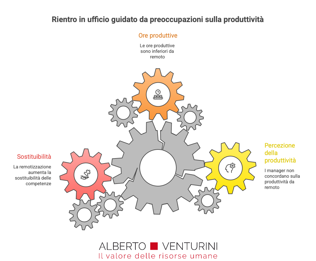cisallineamento tra percezione di produttività (87% dei dipendenti si percepisce più produttivo da remoto – Microsoft) e misurazione manageriale (solo 12% dei manager concorda).